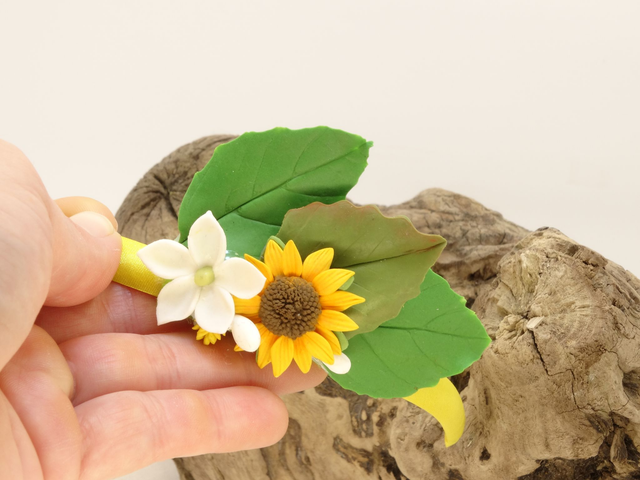 Diadema totalmente hecha a mano con una decoración de girasol y hojas modeladas en arcilla polimérica. Complemento para el pelo muy alegre y veraniego