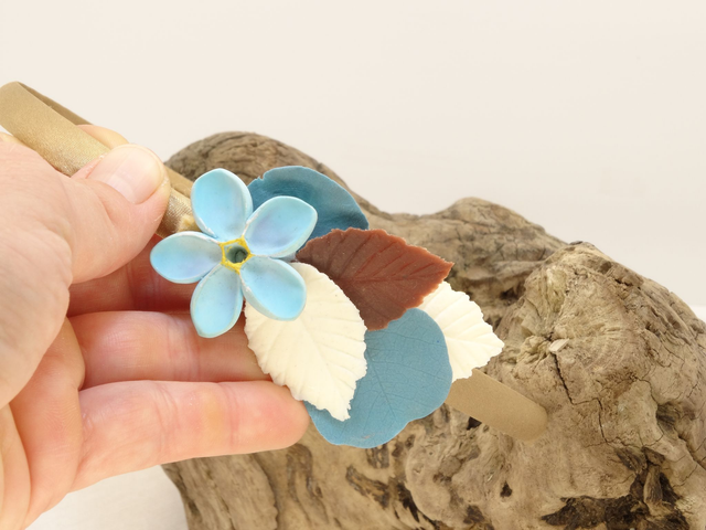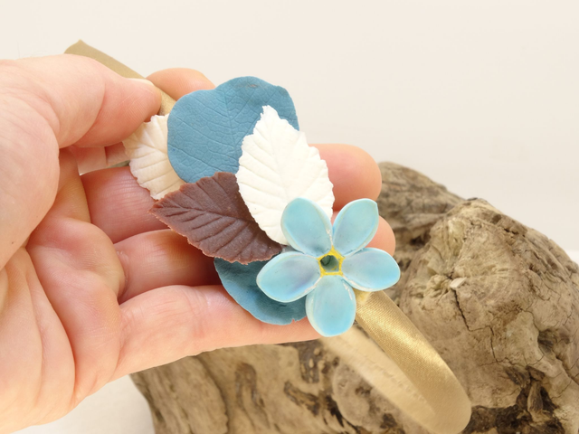 Diadema totalmente hecha a mano con una decoración de hojas y flores en tonos azules y marrones modeladas en arcilla polimérica y porcelana fría flexible. Un precioso complemento con tintes otoñales para amantes de la naturaleza.