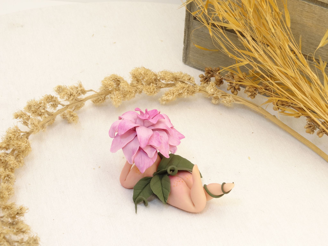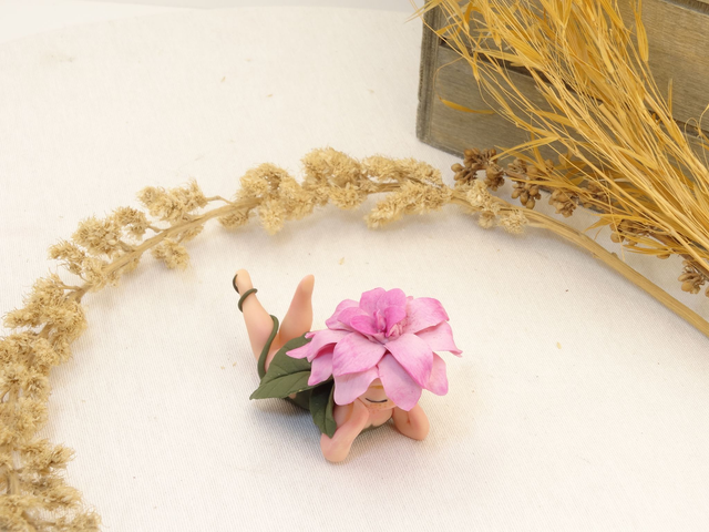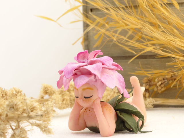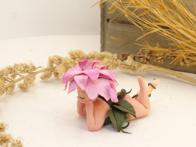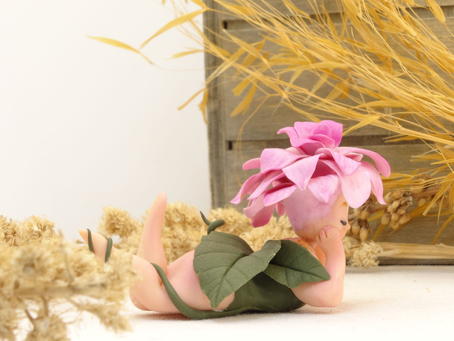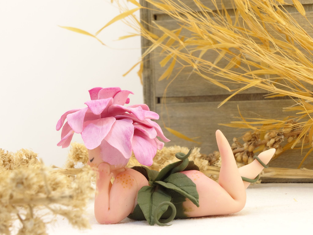 Figura única de un hada coronada con una flor rosa, modelada en arcilla polimérica, resistente y duradero. Cada pieza es única! Adopta una pequeña hada para tu hogar.
