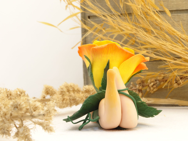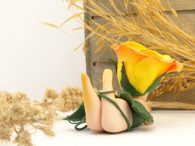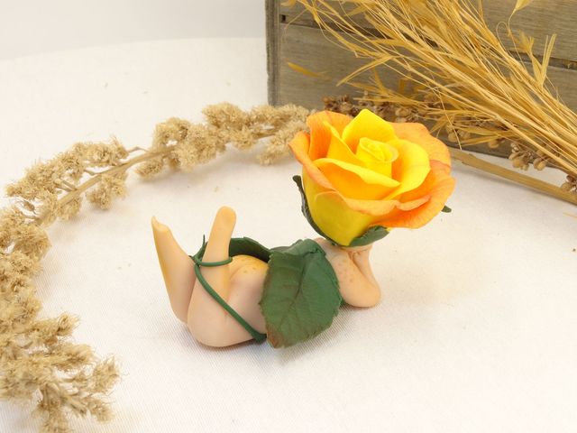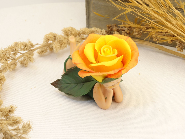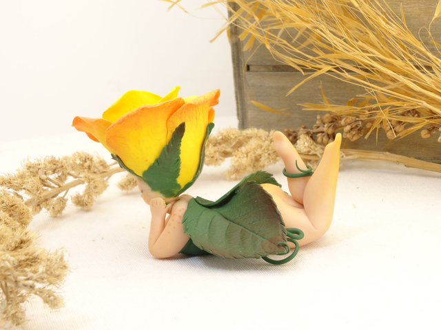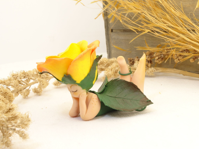 Figura única de un hada coronada con una rosa amarilla, modelada en arcilla polimérica, resistente y duradera. Cada pieza es única! Adopta una pequeña hada para tu hogar.